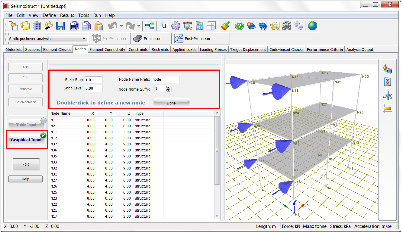 The user can also add nodes through the Graphical Input button. First the user has to select the Snap Level (the default value is 0), then he/she has to double-click on the grid in order to define the node, as illustrated in the figure below.