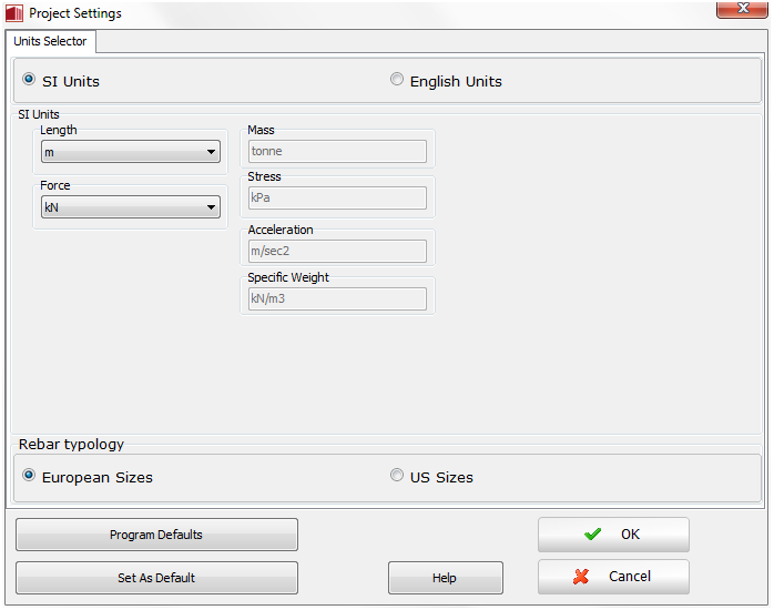 Both SI as well as English units systems can be used in SeismoStruct, with different possible "combinations" being available for each of these two, since users are given the possibility of choosing between the use of two diverse units to define Length and Force quantities; as the units of these two base quantities are changed by the users, the program automatically adjusts the units of the remaining derived entities (Mass, Stress, Acceleration, etc.). Customisation of the Units system is carried out in the Units Selector dialog box, accessible from the main menu (Tools > Units Selector) or through the corresponding toolbar button. ![]()