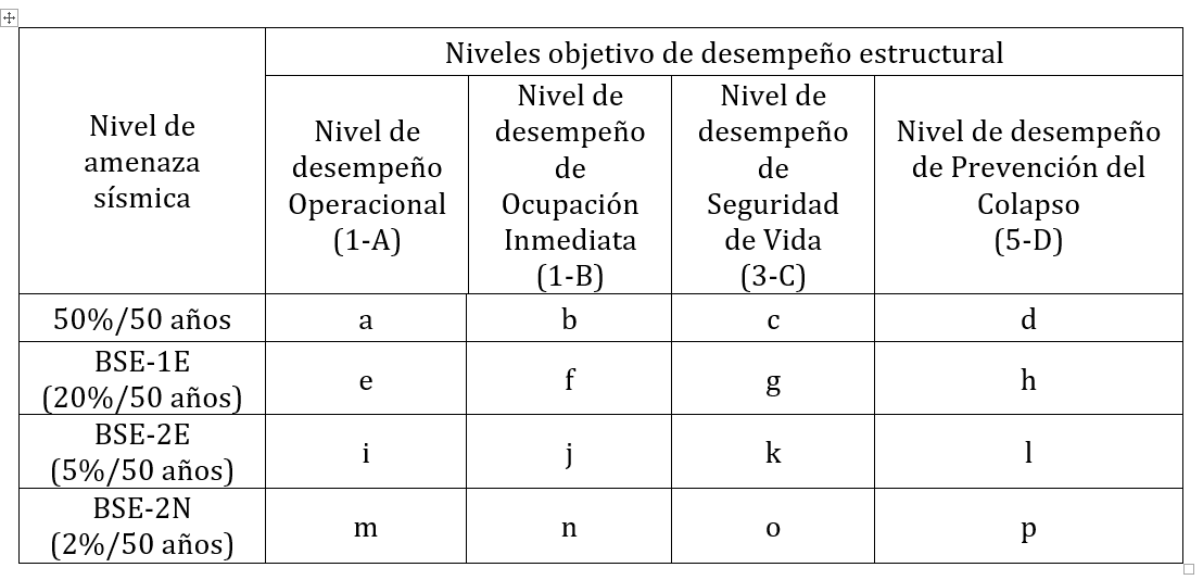 Los niveles de desempeño del edificio objetivo se refieren al estado de daño en la estructura definida a través de cuatro estados límite, a saber, Nivel Operacional (1-A), Ocupación Inmediata (1-B), Seguridad de Vida (3-C) y Prevención del Colapso (5- RE).