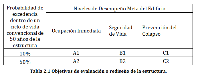 De acuerdo con KANEPE sección 2.2, los objetivos de evaluación o rediseño (Tabla 2.1) consiste de una combinación del nivel de desempeño y de una acción sísmica, dada un “probabilidad aceptable de excedencia dentro del ciclo de vida del edificio” (terremoto de diseño), como se muestra en la Tabla 2.1 siguiente del código KANEPE.