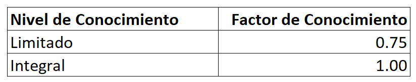 En la siguiente tabla de la sección 15.2.12 de TBDY, los factores de confianza para cada nivel de conocimiento se muestran.