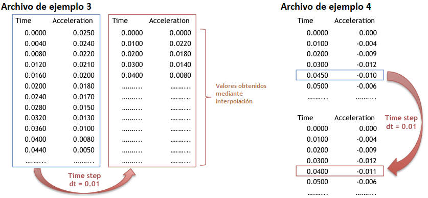 - cargar historiales de tiempos definidos a través de pasos de tiempo no espaciados regularmente; el paso de tiempo que luego adopta el programa es el definido en 'Time Step dt' (vea el ejemplo 4 a continuación).