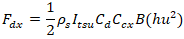 Donde Fdx es la Fuerza Total de Tsunami, Itsu es el Factor de Importancia de Tsunami, Cd es el Coeficiente Drag para el edificio (ver Tabla 6.10-1 de ASCE 7-16 Capítulo 6), h es la profundidad de inundación, u es la velocidad de flujo y Ccx es un coeficiente dado por la ecuación 6.10-3 de ASCE 7-16 capítulo 6 y B es el ancho de la estructura afectada por el Tsunami