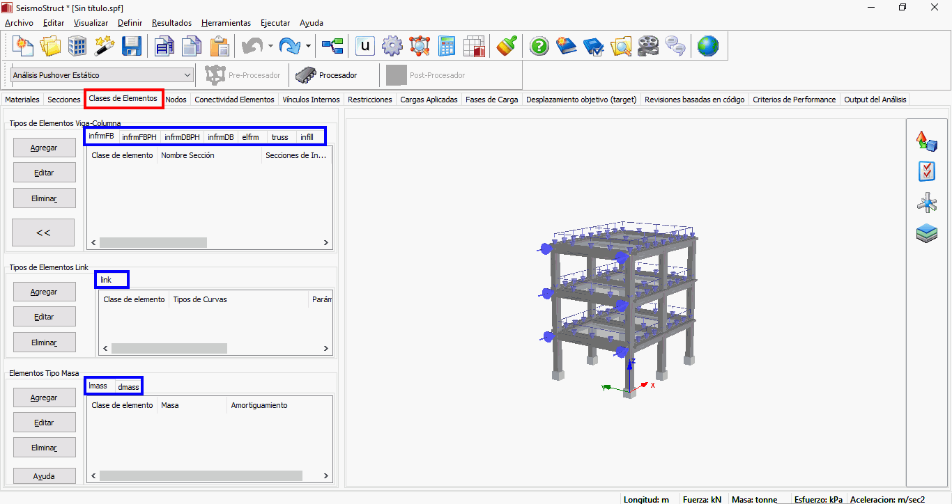 Como se mencionó anteriormente, los tipos de elementos son utilizados para definir clases de elementos (exactamente al igual que los tipos de materiales son utilizados para definir materiales o los tipos de secciones son empleados para definir secciones). Por lo tanto, al igual que para el caso de los materiales y las secciones, en un proyecto de SeismoStruct puede existir un gran número de clases diferentes de elementos que pertenezcan al mismo tipo de elemento (por ej., para modelar dos columnas el usuario necesita definir dos clases de elementos diferentes, ambas pertenecientes al mismo tipo de elemento). Las clases de elementos definidas en este módulo son luego utilizadas en el módulo de Conectividad de Elementos para crear los elementos que efectivamente permiten la construcción del modelo estructural.