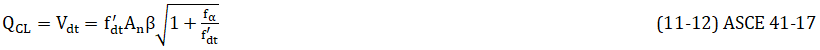 En ASCE 41-17 y para muros URM de mampostería no reforzadas, se utiliza el valor más bajo de la resistencia al deslizamiento de la junta horizontal y la resistencia a la tensión diagonal, de acuerdo con las siguientes expresiones: