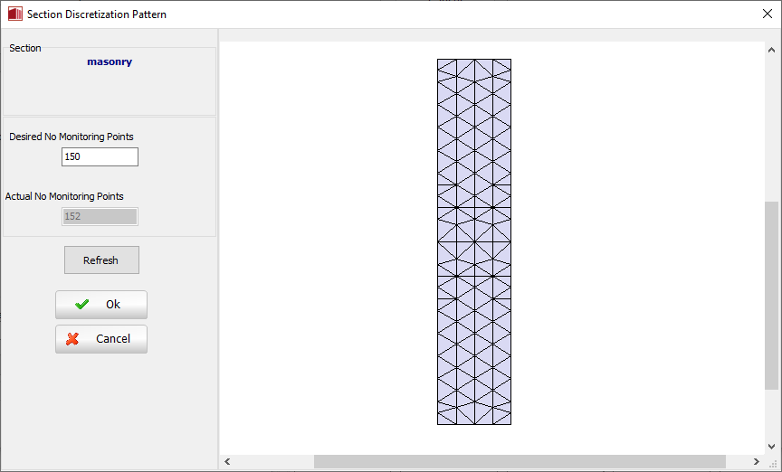 En el cuadro de diálogo Esquema de Discretización de la Sección, el software proporciona el número deseado y real (después de que se haya realizado la discretización de sección, empleando procedimientos de triangulación) de puntos de monitoreo que se emplearán en el análisis. Al hacer clic en el botón Actualizar, es posible actualizar la vista de la sección de discretización.
