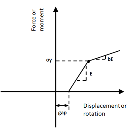La curva Gap_elpl se caracteriza por un esfuerzo cero hasta que la deformación supere el valor de la separación inicial y un comportamiento perfectamente elástico después hasta el punto de fluencia. Después del punto de fluencia, la curva entra en la región de la plasticidad. El endurecimiento cinemático también está disponible. Deben definirse cuatro parámetros para describir completamente las características mecánicas de la curva: