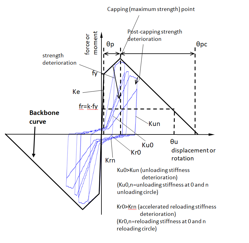 La Curva de Respuesta Histerética con Deterioro de Ibarra-Medina-Krawinkler Modificada con Respuesta Histerética y Pinch se basa en el modelo que fue propuesto principalmente por Ibarra et al. [2005] y luego modificado por Lignos y Rawinkler [2009]. El modelo se asemeja a los Modelos modificados de deterioro de Ibarra-Medina-Krawinkler con respuesta histéresica bilineal y de pico orientado, ya que se basa en una curva de estructura que representa el comportamiento de la carga monotónica y establece límites de esfuerzo y deformación, pero utiliza un modelo histerético pellizcado para el modelo de la curva de back-bone. El histerético pellizcado es similar al orientado al pico, excepto que la recarga consta de dos partes. Inicialmente, la ruta de recarga se dirige hacia un "punto de ruptura", que es una función de la máxima deformación permanente y la carga máxima experimentada en la dirección de carga (Ibarra et al. [2005]). El modelo incluye cuatro modos de deterioro cíclico: a) deterioro de la resistencia básica, b) deterioro de la resistencia posterior a la nivelación, c) deterioro de la rigidez de descarga/recarga y d) deterioro de la rigidez en la recarga. El modelo de deterioro modificado Ibarra-Medina Krawinkler con respuesta histéresis pellizcada simula el comportamiento de las vigas de concreto armado que falla principalmente en modo de corte. Este modelo también es capaz de simular el comportamiento histerético de las conexiones de cizallamiento, las conexiones de la placa de escuadra de viga a columna y los componentes de madera. En total, se deben definir 27 variables para el modelo.