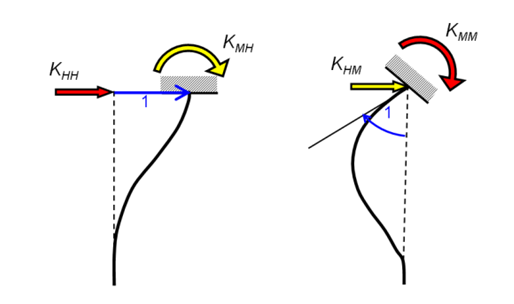 La rigidez de la pila para las direcciones vertical, horizontal y de rotación (K_VV, K_HH, K_MM, K_HM, K_TT)