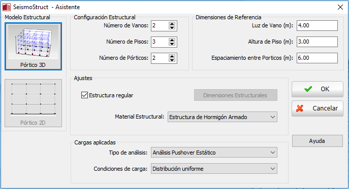 Para crear un modelo de edificio usando el Asistente, el usuario debe decidir primero si él/ella desea crear una estructura 2D o 3D, y luego el número de bahías, pisos y marcos puede ser asignado, junto con los valores de referencia para cada longitud de bahía, altura de piso y espaciamiento de marcos. Si la estructura es regular (p. ej. todas las bahías tienen la misma longitud, todos los pisos tienen la misma altura y todos los marcos están espaciados de la misma forma) entonces las medidas de referencia serán las dimensiones actuales. Si, de otra manera, la estructura es geométricamente irregular, entonces la opción de Estructura Regular debe ser desmarcada para que el usuario pueda acceder la ventana de diálogo de Dimensiones Estructurales, donde las dimensiones reales de longitud de bahías, alturas de piso y distancias entre marcos pueden ser definidas. De manera predeterminada, las dimensiones de referencia se adoptan.