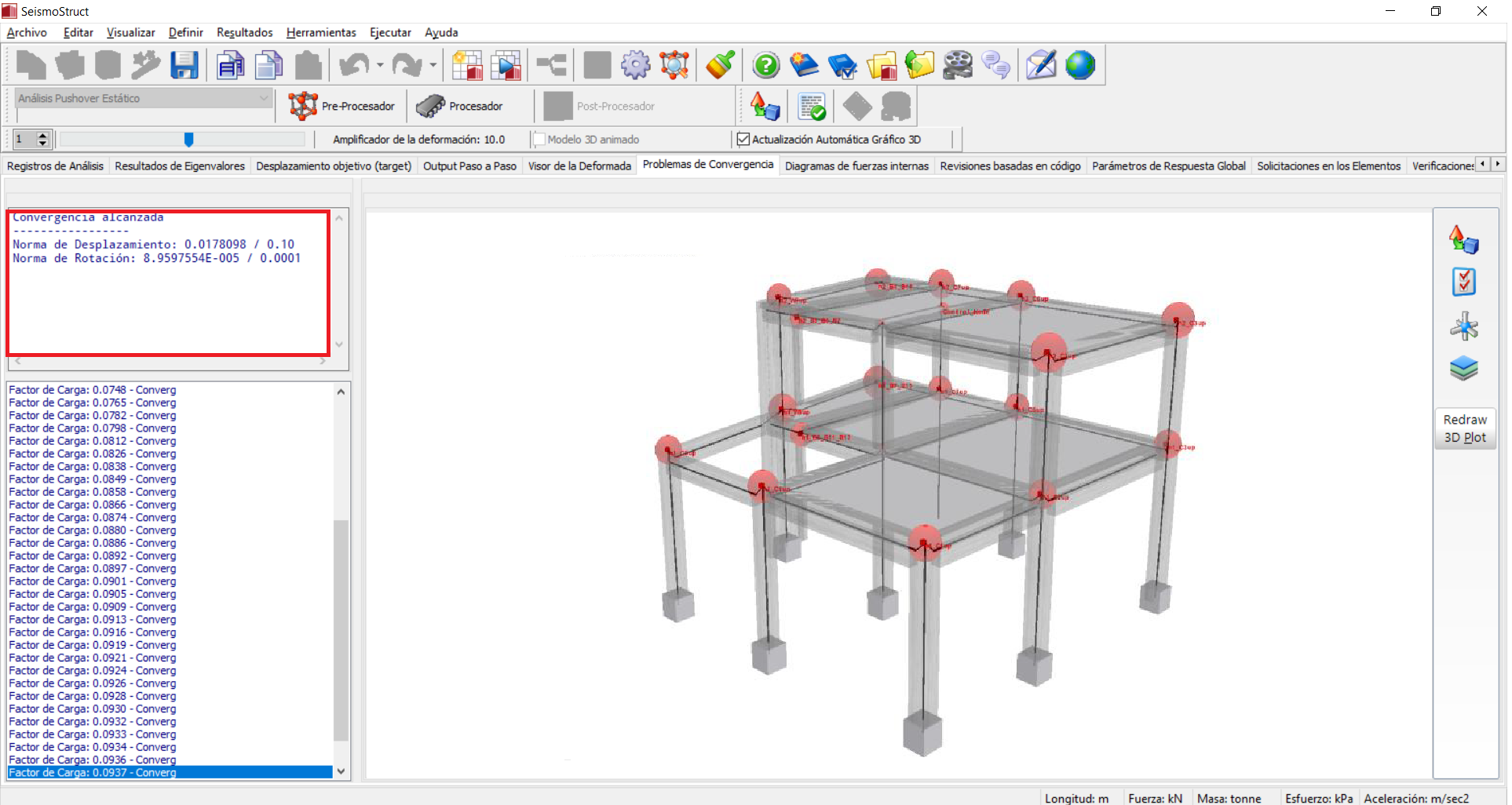 Siempre que surgen problemas de convergencia, los usuarios pueden ser informados sobre los elementos que causan las soluciones divergentes. Los elementos o las ubicaciones de la estructura donde se producen los problemas de convergencia se marcan en formato de vista 3D, mientras que la información sobre el tipo de divergencia (valor de las normas de convergencia y sus límites, mensaje de divergencia y los elementos o nodos correspondientes) se muestra en la esquina superior izquierda de la pantalla.