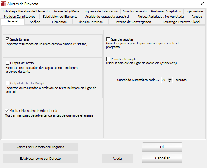 - Para la mayoría de las aplicaciones, no hay necesidad de modifica las opciones predefinidas de los Ajustes del Proyecto, ya que estas fueron escogidas para satisfacer los requisitos de los modelos y análisis estándar, llevando a soluciones optmizadas en términos de desempeño y eficiencia así como precisión en los resultados.