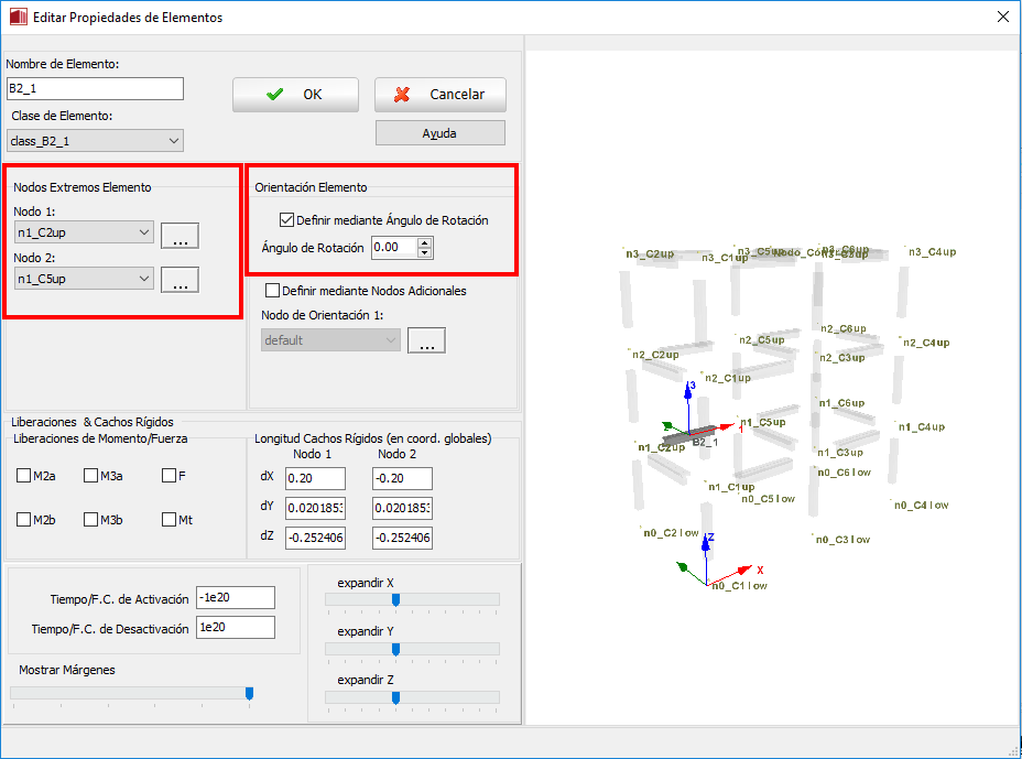 Los diferentes elementos de la estructura son definidos en el módulo Conectividad de Elementos, en donde se especifican sus nombres, clases, nodos correspondientes, cachos rígidos, liberaciones de fuerma/momento y eventualmente su tiempo de activación/L.F.