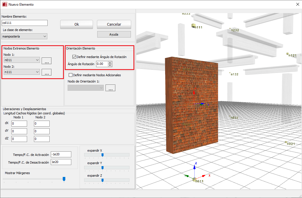 Por otra parte, para cada elemento de mampostería es posible especificar Longitudes de Cachos Rígidos (en coordenadas globales), asignando un valor de dX, dY y dZ a cada nodo extremo (designados como Nodos 1 y 2).