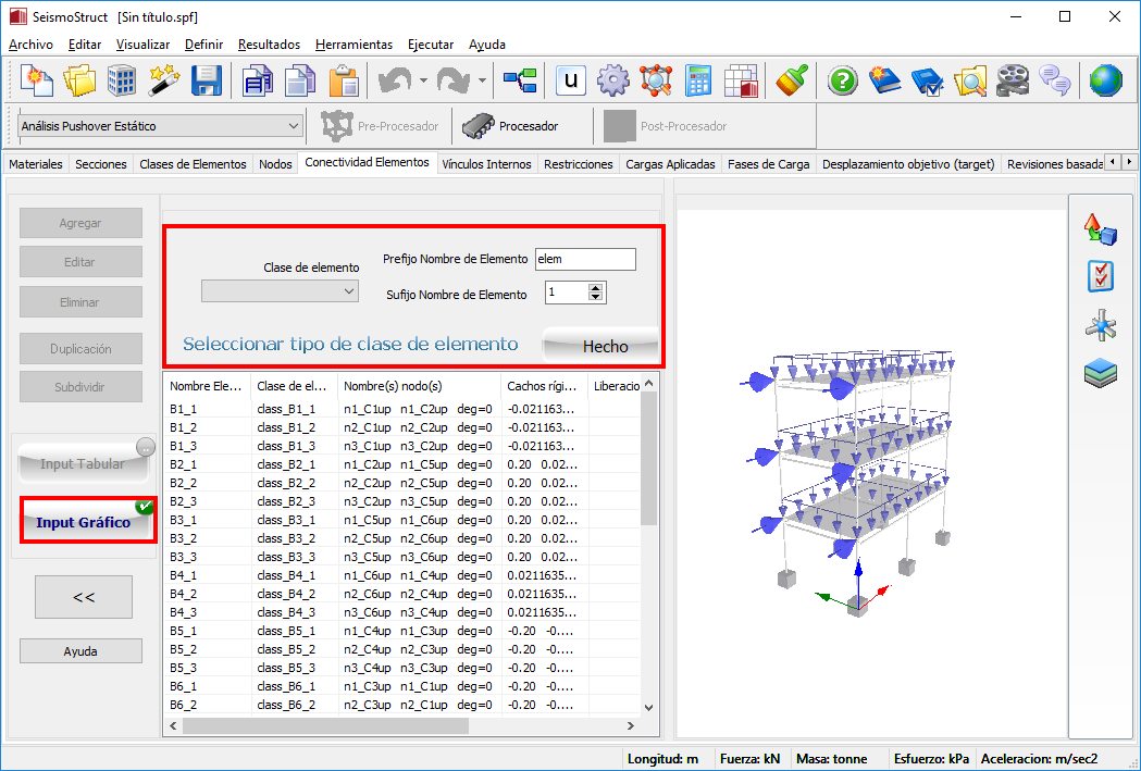 Es posible agregar elementos mediante el botón Input Gráfico. En primer lugar, el usuario debe seleccionar la Clase de Elemento y luego seleccionar los nodos correspondientes para definir el elemento, como se ilustra a continuación: