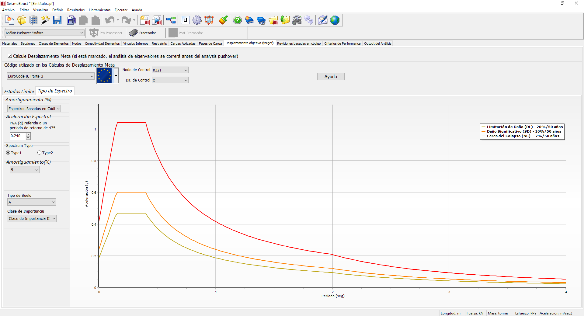En el caso de análisis de pushover (convencional o adaptable) los usuarios pueden seleccionar el cálculo automático del desplazamiento objetivo. Si la casilla de Cálculo de Desplazamiento Objetivo está marcada, entonces un análisis de Eigenvalores se llevará a cabo antes del análisis de pushover. Los siguientes parámetros deben ser definidos por el usuario para poder calcular el Desplazamiento Objetivo: