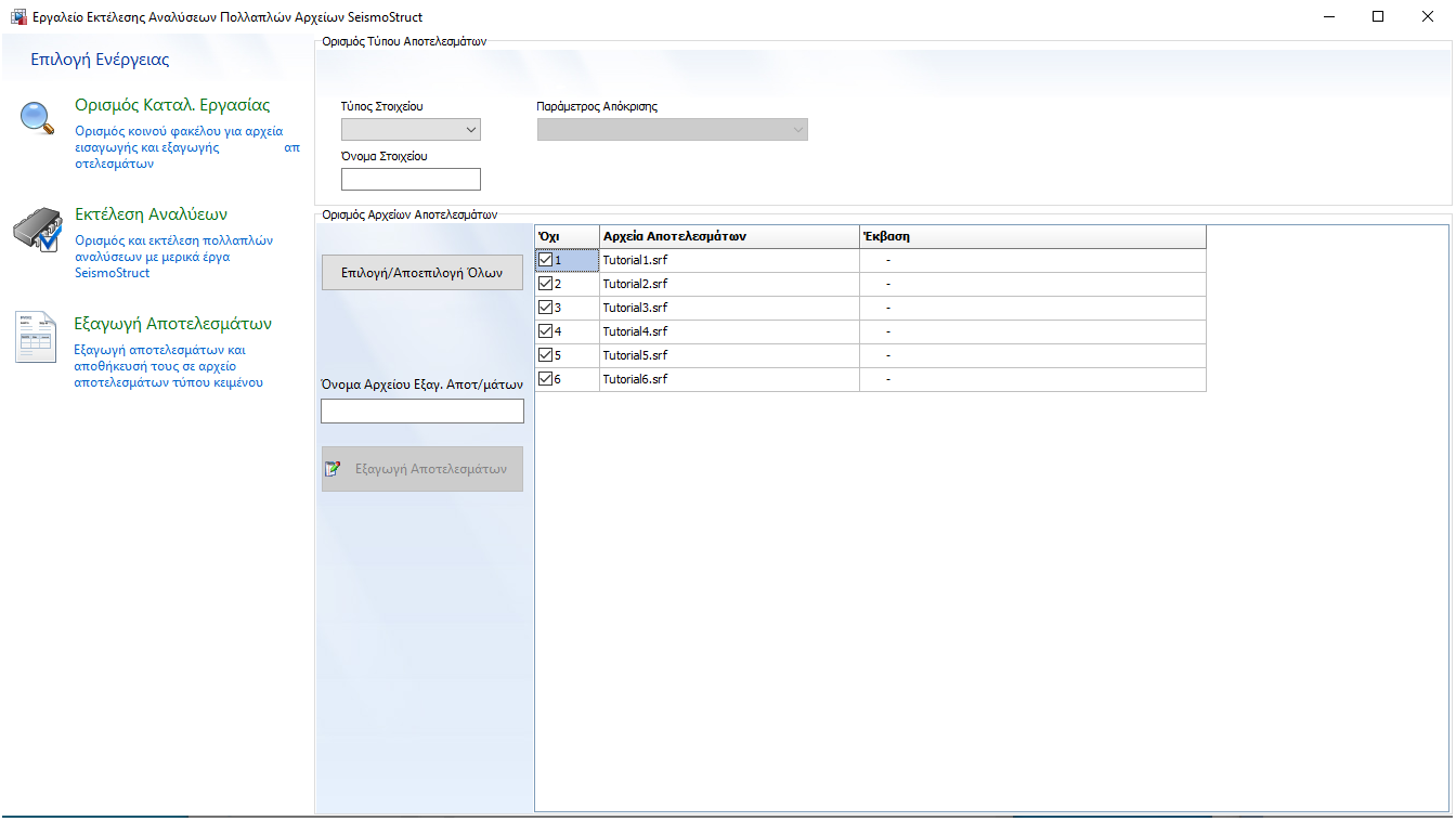 Σε αυτήν την ενότητα οι χρήστες μπορούν να επιλέξουν ποιες από τις αναλύσεις θα εκτελεστούν. Αυτό γίνεται επιλέγοντας και από-επιλέγοντας τα πεδία στον πίνακα, όπου εμφανίζεται μια λίστα με όλα τα αρχεία έργου *.spf. Το πρόγραμμα αυτόματα επιλέγει όλα τα έργα, όπου δεν βρέθηκε φάκελος αποτελεσμάτων. Αντίθετα, όταν υπάρχει αρχείο αποτελεσμάτων του SeismoStruct, που σημαίνει ότι η ανάλυση έχει ήδη εκτελεστεί, το αντίστοιχο πεδίο δεν είναι επιλεγμένο. Η επιλογή ταυτόχρονης εκτέλεσης πολλαπλών αναλύσεων έχει εισαχθεί από το SeismoBatch 2016 προκειμένου να εκμεταλλευτεί πλήρως το πλεονέκτημα των επεξεργαστών με πολλαπλούς πυρήνες.