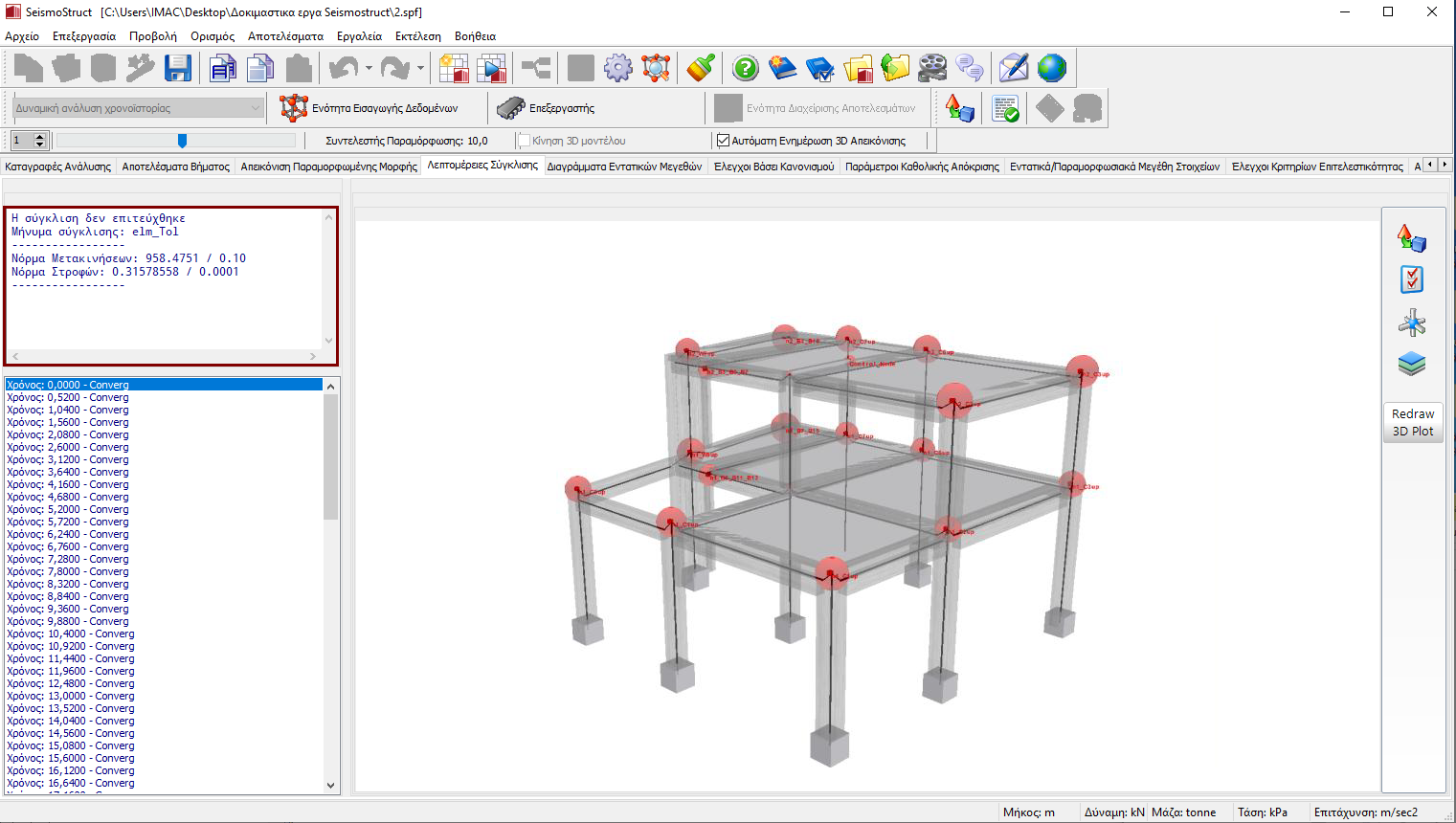 Όποτε προκύπτουν προβλήματα σύγκλισης, οι χρήστες μπορούν να ενημερωθούν για τα στοιχεία που προκαλούν τις αποκλίνουσες λύσεις. Τα στοιχεία ή οι θέσεις της κατασκευής όπου προκαλούνται τα προβλήματα σύγκλισης, σημειώνονται στη 3D προβολή, ενώ πληροφορίες σχετικά με τον τύπο της απόκλισης (νόρμες της σύγκλισης και οι τα όριά τους, μήνυμα απόκλισης και τα αντίστοιχα στοιχεία ή κόμβοι) απεικονίζονται στην πάνω-αριστερή γωνία της οθόνης.