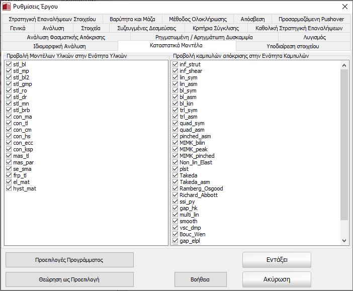 Εδώ, μπορούν να ενεργοποιηθούν μοντέλα υλικών και καμπύλες απόκρισης που θα απεικονιστούν, αντίστοιχα, στην Ενότητα Υλικών και στην Ενότητα Κατηγορίες Στοιχειών.