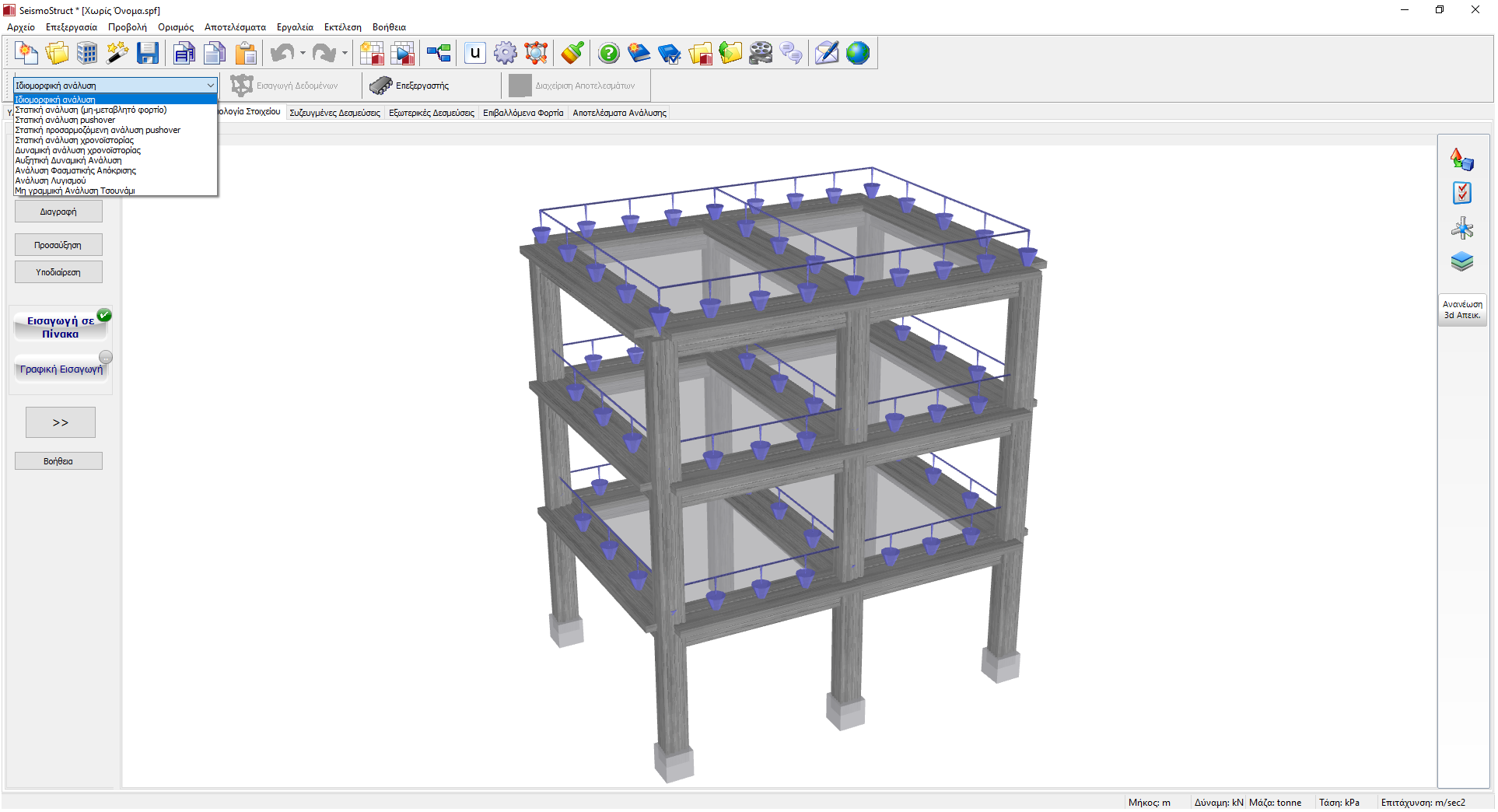 Διαφορετικοί τύποι ανάλυσης απαιτούν διαφορετικά δεδομένα από το μοντέλο. Συνεπώς, ενώ τα πλαισιακά στοιχεία (ελαστικά και ανελαστικά) και τα στοιχεία συνδέσμου μπορούν να χρησιμοποιηθούν για κάθε τύπο ανάλυσης, τα στοιχεία μάζας (lmass και dmass) δεν χρειάζονται στις στατικές αναλύσεις (με εξαίρεση την στατική προσαρμοζόμενη pushover) και μπορούν να χρησιμοποιηθούν μόνο σε δυναμική ανάλυση, σε ιδιομορφική και σε ανάλυση φασματικής απόκρισης. Ακόμη, τα στοιχεία απόσβεσης (dashpt) χρειάζονται μόνο σε δυναμική ανάλυση και ΑΔΑ. Όταν αλλάζει ο τύπος της ανάλυσης, το πρόγραμμα προσπαθεί αυτόματα να εφαρμόσει τις απαραίτητες τροποποιήσεις στο υφιστάμενο μοντέλο. Για παράδειγμα, αν σε ένα ήδη προσομοιωμένο έργο με δυναμική ανάλυση, η ανάλυση αλλάξει σε στατική ανάλυση Pushover, το SeismoStruct θα αφαιρέσει αυτόματα στα στοιχεία μάζας και απόσβεσης.