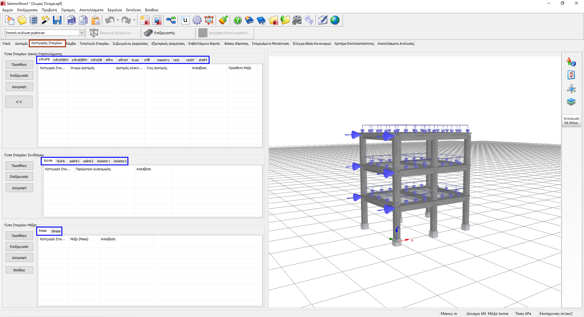 - Κάποιοι τύποι στοιχείων (π.χ. στοιχεία μάζας και βαρύτητας) δεν μπορούν να χρησιμοποιηθούν σε συγκεκριμένες αναλύσεις (π.χ. στατική ανάλυση) και για αυτό μπορεί να μην είναι πάντα διαθέσιμα στην ενότητα Κατηγορίες Στοιχείων.