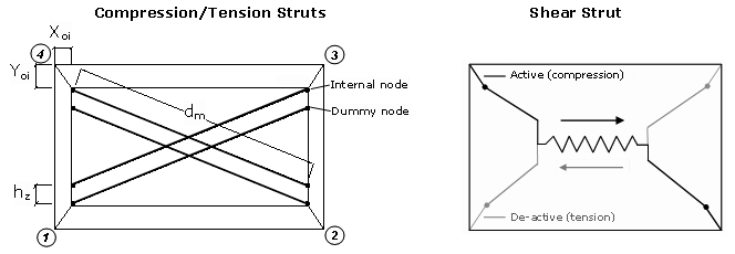 Επίσης, όπως μπορεί να παρατηρηθεί στην εικόνα παρακάτω, τέσσερις εσωτερικοί κόμβοι χρησιμοποιούνται για να ληφθούν υπόψη τα πραγματικά σημεία επαφής μεταξύ των πλαισίων και των πάνελ τοιχοπλήρωσης (δηλ. για να λάβουν υπόψη το πλάτος και το ύψος των υποστυλωμάτων και των δοκών αντίστοιχα), ενώ τέσσερις κόμβοι εισάγονται με στόχο να λάβουν υπόψη το μήκος επαφής μεταξύ των πλαισίων και των πάνελ τοιχοπλήρωσης. Όλες οι εσωτερικές δυνάμεις μετατρέπονται στους εξωτερικούς τέσσερις κόμβους (οι οποίοι όπως σημειώνεται εδώ, πρέπει να οριστούν σε αντί-ωρολογιακή σειρά) όπου το στοιχείο συνδέεται στο πλαίσιο.