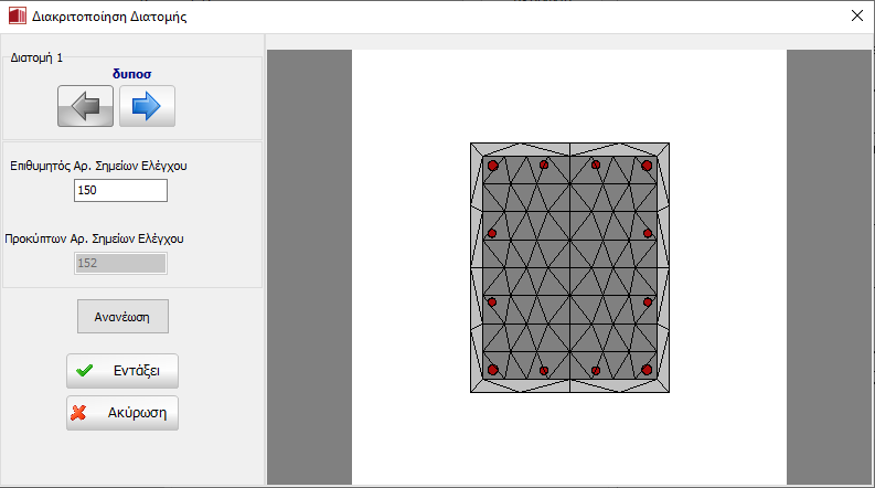 Ο αριθμός των ινών διατομών που χρησιμοποιούνται στους υπολογισμούς ισορροπίας σε κάθε μια από τις διατομές ολοκλήρωσης του στοιχείου, πρέπει να οριστεί. Οι χρήστες μπορούν να κάνουν κλικ στο κουμπί Προβολή Διακριτοποίησης προκειμένου να δουν την διακριτοποίηση της διατομής (δείτε την παρακάτω εικόνα).