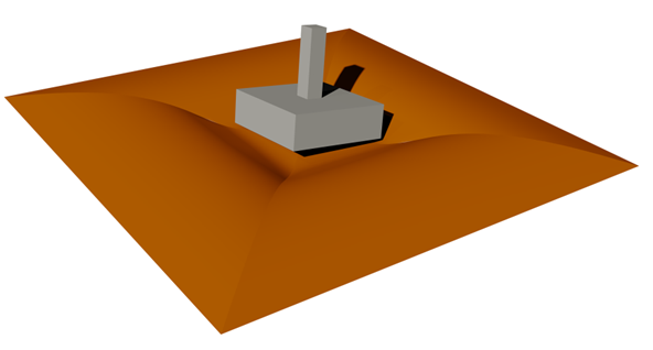 Εφαρμόζεται ένα μοντέλο ανασήκωσης το οποίο βασίζεται σε μια ελαστική ανασήκωση μη γραμμικής απόκρισης η οποία θεωρεί κάποια μείωση της διεπαφής εδάφους/θεμελίου λόγω μη ανακτήσιμων αλλαγών στη γεωμετρία. Χρησιμοποιείται επίσης ένα μοντέλο πλαστικότητας οριακής επιφάνειας το οποίο λαμβάνει υπόψη τις ταυτόχρονες ελαστικές ανασηκώσεις και πλαστικές μη γραμμικές αποκρίσεις. Τέλος, αυτός ο σχηματισμός μακρο-στοιχείων εφαρμόζεται πλήρως σε περιπτώσεις τρισδιάστατης φόρτισης. Το παραπάνω σχηματικά αντιπροσωπεύουν την παρακάτω εικόνα.