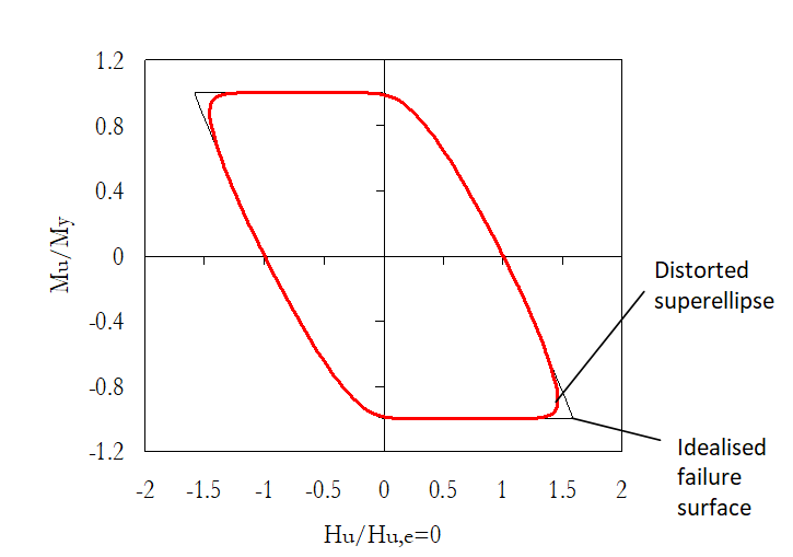 Μία “στρογγυλοποιημένη” προσεγγιστική επιφάνεια αστοχίας προτάθηκε από τους Correia and Pecker [2019a], η οποία βασίζεται στην λεγόμενη υπερέλλειψη. Υποθέτοντας ότι η υπερέλλειψη είναι κεντραρισμένη στο σημείο (Hc, Mc), με ένα μήκος οριζόντιου άξονα και ένα μήκος κατακόρυφου άξονα My, το οποίο επίσης υπερκαλύπτεται από την παραμόρφωση του σχήματος του, γ<0, αυτή η κατά προσέγγιση επιφάνεια αστοχίας μπορεί να εκφραστεί ως: