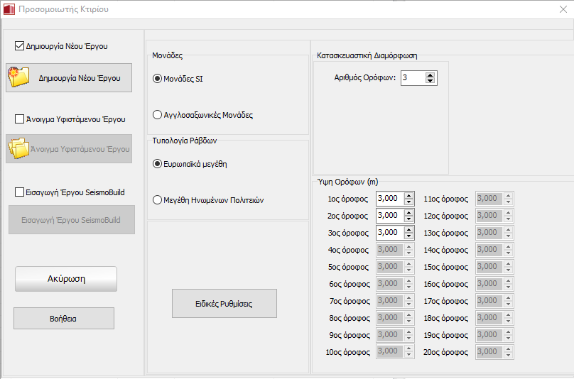Προκειμένου να δημιουργήσετε ένα μοντέλο κατασκευής μέσω του Προσομοιωτή Κτιρίου, μπορούν να οριστούν ο αριθμός των ορόφων και τα ύψη τους, απο 1 έως 100 όροφοι. Μπορούν να επιλεγούν διαφορετικά ύψη σε κάθε όροφο ή μπορεί να επιλεγεί η δυνατότητα εφαρμογής ενός κοινού ύψους σε ένα εύρος ορόφων. Μπορούν επίσης να καθοριστούν έως τρεις υπόγειοι όροφοι και το ύψος τους.