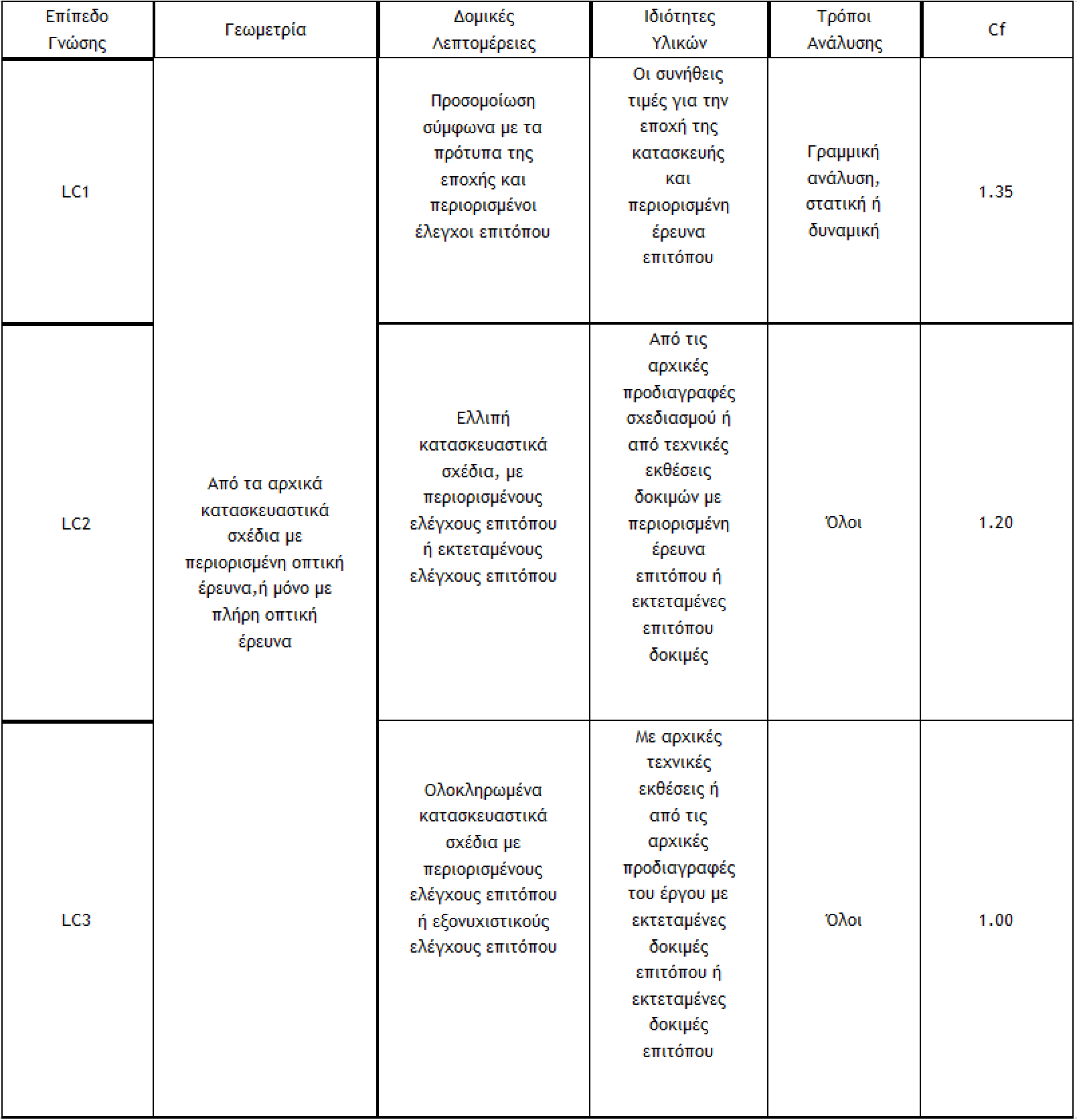 Στον παρακάτω πίνακα της ενότητας C8.5.4.2 του τεύχους σχολιασμού του NTC-18, παρέχεται συνοπτική παρουσίαση και συστάσεις για τους συντελεστές αξιοπιστίας καθώς και οι μέθοδοι ανάλυσης για κάθε επίπεδο γνώσης.