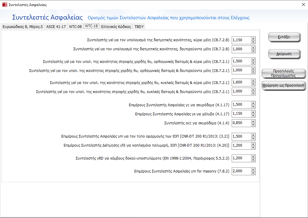 Οι τιμές των συντελεστών ασφαλείας και οι εκφράσεις του Κανονισμού που χρησιμοποιούνται, μπορούν να καθοριστούν μέσω του πλαισίου διαλόγου που ανοίγει από το αντίστοιχο κουμπί. Σημειώνεται ότι οι προεπιλεγμένες τιμές των συντελεστών ασφαλείας είναι αυτές που ορίζονται από τον NTC-18.