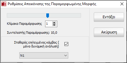 Σημείωση: Προκειμένου να είναι διαθέσιμες οι απεικονίσεις παραμορφωμένης μορφής, οι παράμετροι απόκρισης κόμβων πρέπει να έχουν εξαχθεί ως αποτελέσματα για όλους τους δομικούς κόμβους (δείτε ενότητα Αποτελέσματα Ανάλυσης), αλλιώς η Διαχείριση Αποτελεσμάτων δε θα έχει επαρκείς πληροφορίες για να υπολογίσει αυτόν τον τύπο απεικονίσεων.