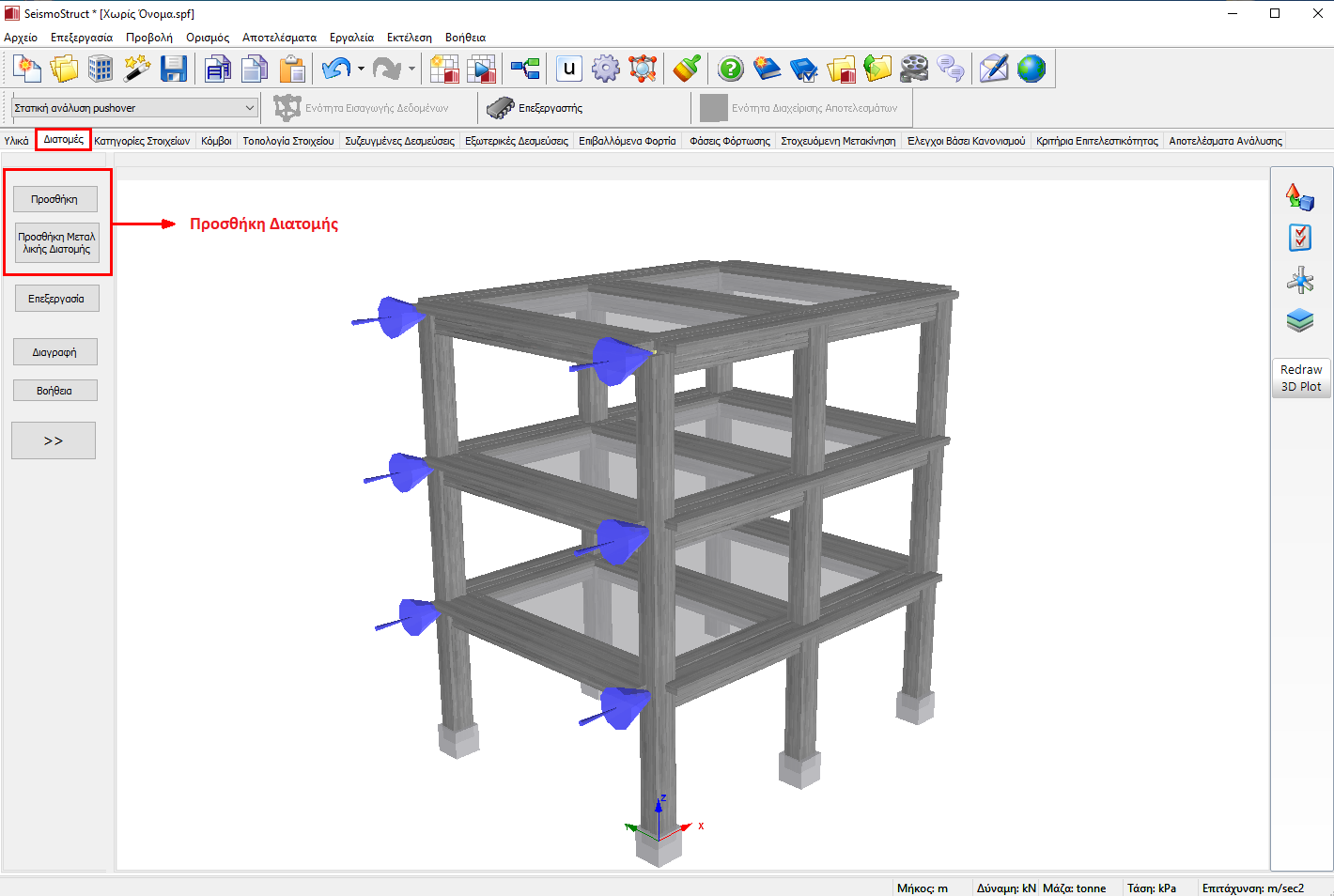 Επίσης, στο SeismoStruct μπορούν να χρησιμοποιηθούν προκαθορισμένες διατομές χάλυβα κάνοντας κλικ στο κουμπί Προσθήκη Μεταλλικής Διατομής. Μια βάση δεδομένων με τις πιο κοινές διατομές χάλυβα (π.χ. HEA, HEB, IPE κλπ.) είναι διαθέσιμη, καθώς επίσης και διατομές W και HSS. Επιπλέον, είναι δυνατόν να εισάγετε διπλές διατομές χάλυβα κάνοντας κλικ στο αντίστοιχο πεδίο στο πλαίσιο διαλόγου των Νέων Τυποποιημένων Διατομών.