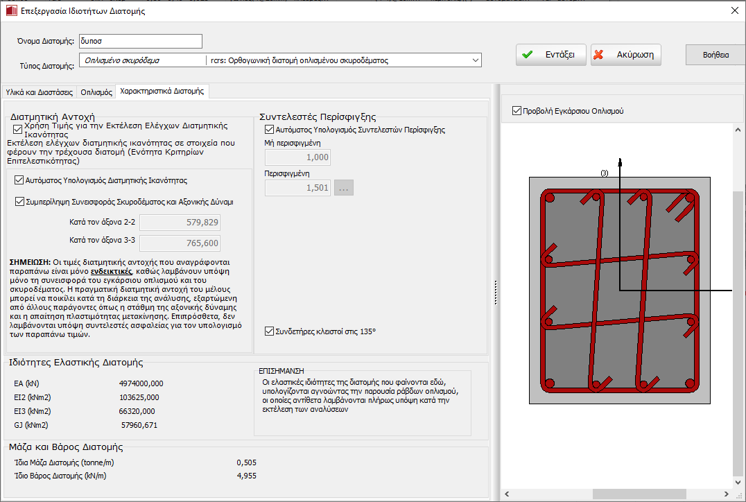 - Οι τιμές EA, EI & GJ που εμφανίζονται σε αυτήν την ενότητα είναι απλώς ενδεικτικές (δηλ. δεν χρησιμοποιούνται στην ανάλυση) και υπολογίζονται χρησιμοποιώντας ελαστικές ιδιότητες υλικών απο το κύριο υλικό της διατομής (δηλ. σκυρόδεμα σε διατομές Ο/Σ και χάλυβα σε διατομές χάλυβα). Δεν συμβαίνει διακριτοποίηση της διατομής σε σημεία παρακολούθησης στην Εισαγωγή Δεδομένων (όπως συμβαίνει κατά τη διάρκεια της ανάλυσης).