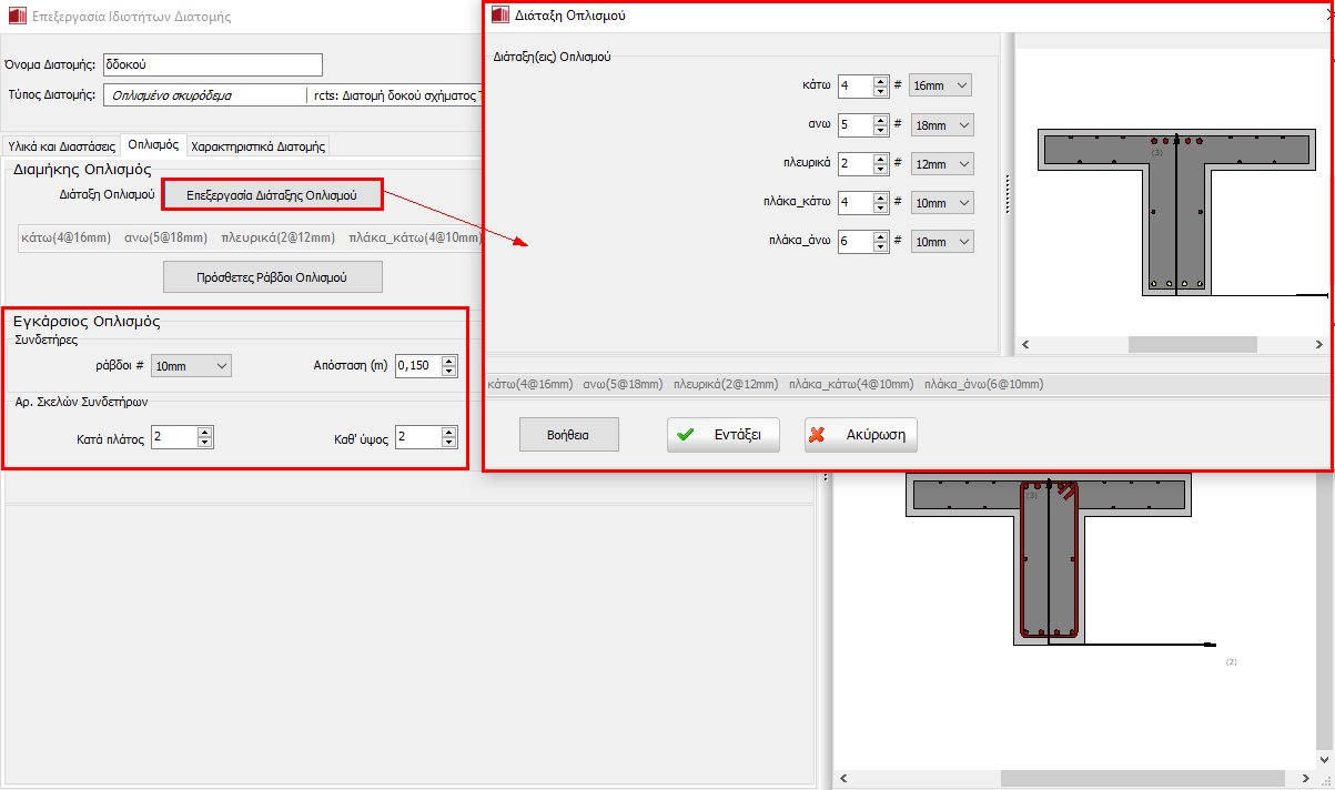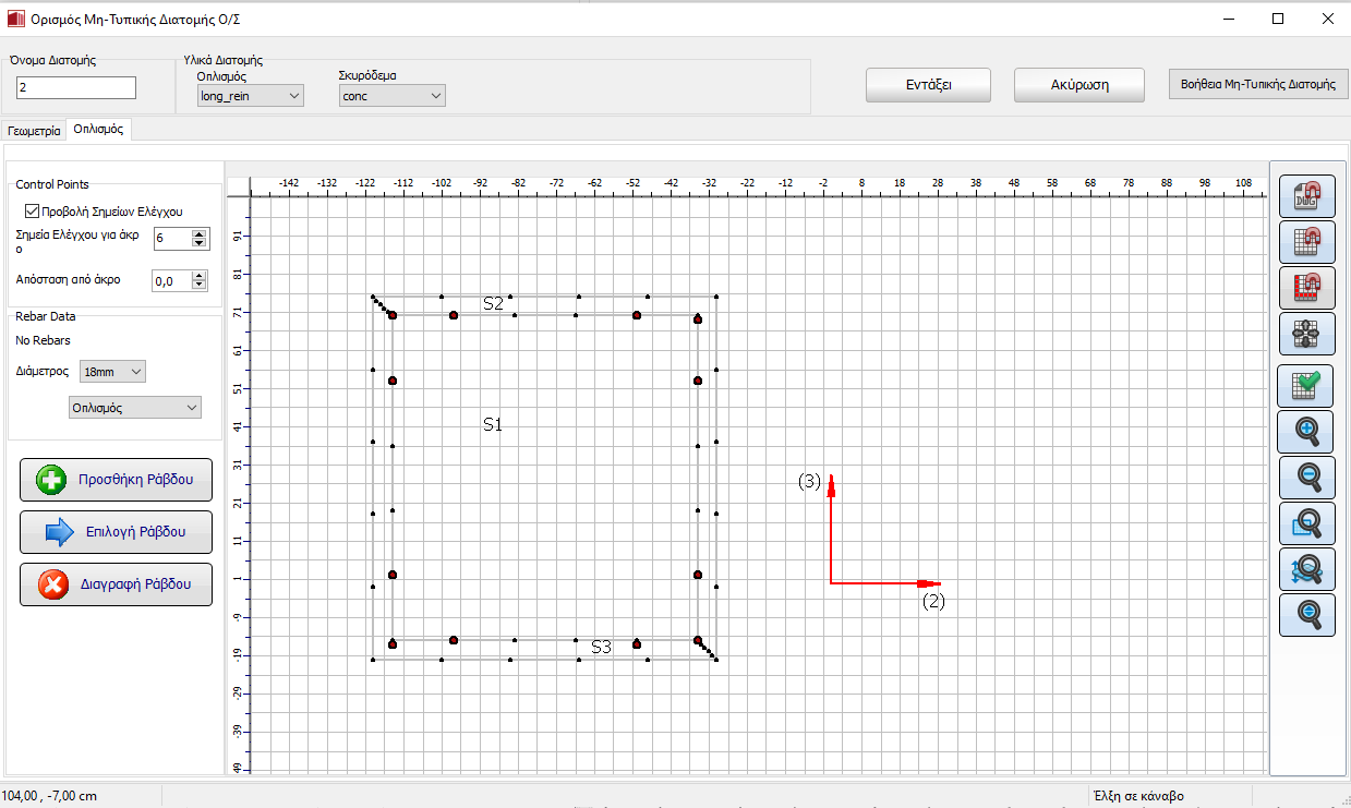 Ο οπλισμός διατομής καθορίζεται στην αντίστοιχη καρτέλα με τη βοήθεια πολλών σημείων ελέγχου εσωτερικά ή στην περίμετρο των εισαχθέντων επιφανειών. Και πάλι η εισαγωγή γίνεται γραφικά με κλικ στα σημεία ελέγχου.