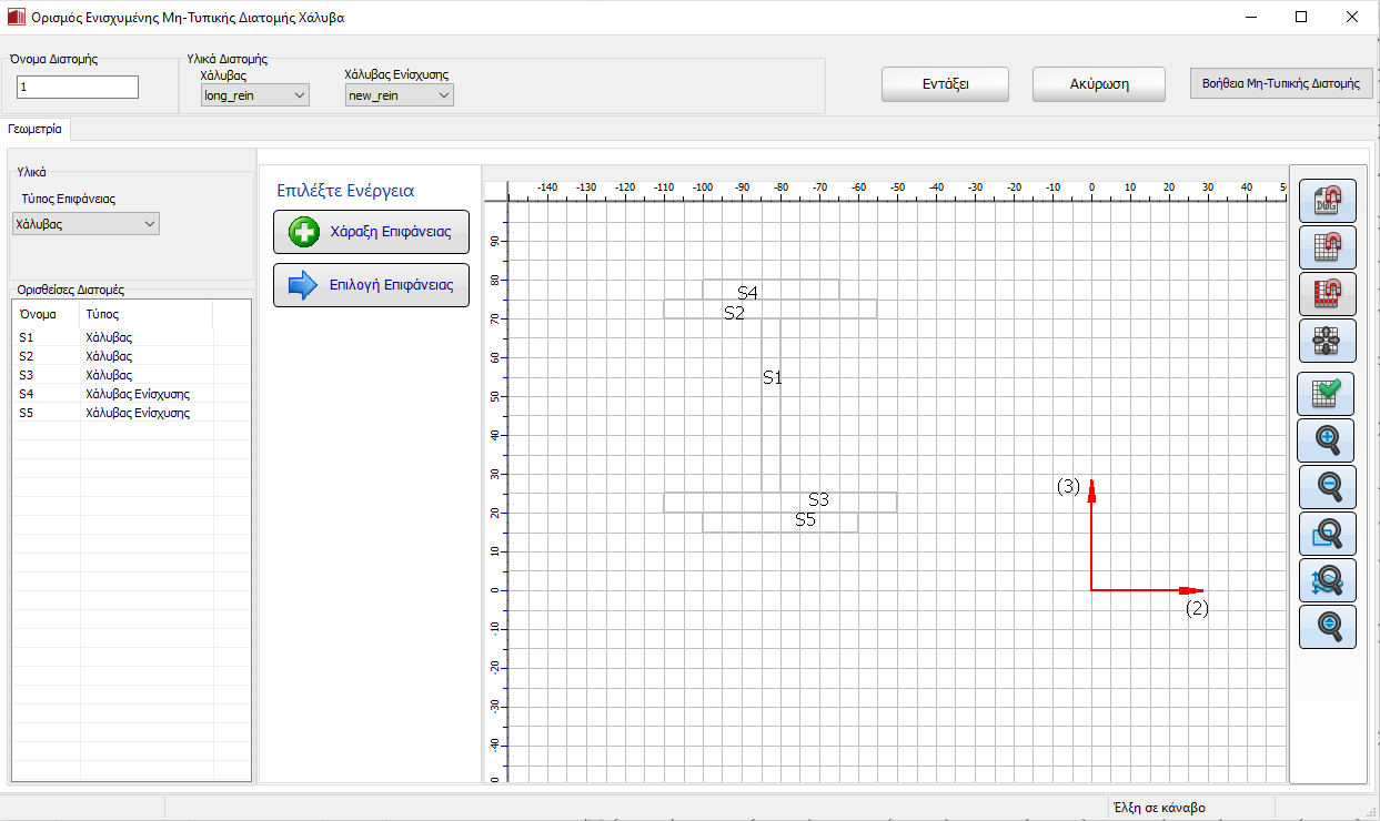 Εκτός από τις τυπικές διατομές της βιβλιοθήκης του SeismoStruct, μπορούν επίσης να οριστούν διατομές χάλυβα ή οπλισμένου σκυροδέματος οποιουδήποτε σχήματος. Υποστηρίζονται τόσο οι απλές όσο και οι ενισχυμένες παραλλαγές των διατομών. Οι χρήστες μπορούν να ορίσουν έως και 9 επιφάνειες διατομών. Οι επιφάνειες καθορίζονται γραφικά με την περίμετρό τους αφού κάνετε κλικ στο κουμπί Χάραξη Επιφάνειας. Οι καθορισμένες περιοχές μπορούν να επιλεγούν και στη συνέχεια να διαγραφούν με τα αντίστοιχα κουμπιά. Οι λειτουργίες και οι εντολές στη δεξιά πλευρά της οθόνης (έλξη σε επιφάνεια, έλξη σε κάναβο, κατακόρυφα/οριζόντια, περιήγηση χωρίς εστίαση, μεγέθυνση, μίκρυνση, μεγέθυνση μέσω παραθύρου και μεγέθυνση/μίκρυνση όλων) μπορούν να διευκολύνουν περαιτέρω τη γραφική εισαγωγή.