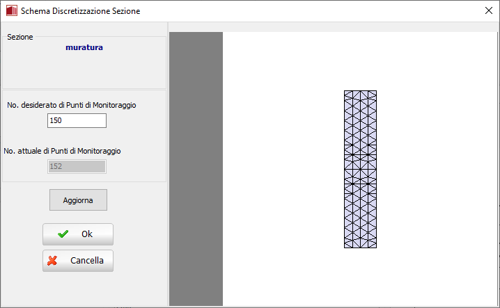 Nella finestra Schema Discretizzazione Sezione il software fornisce il numero desiderato ed effettivo di punti di monitoraggio che saranno impiegati nell’analisi (dopo che è stata eseguita la discretizzazione della sezione, impiegando procedure di triangolazione). Premendo sul pulsante Aggiorna è possibile aggiornare la visualizzazione della discretizzazione.