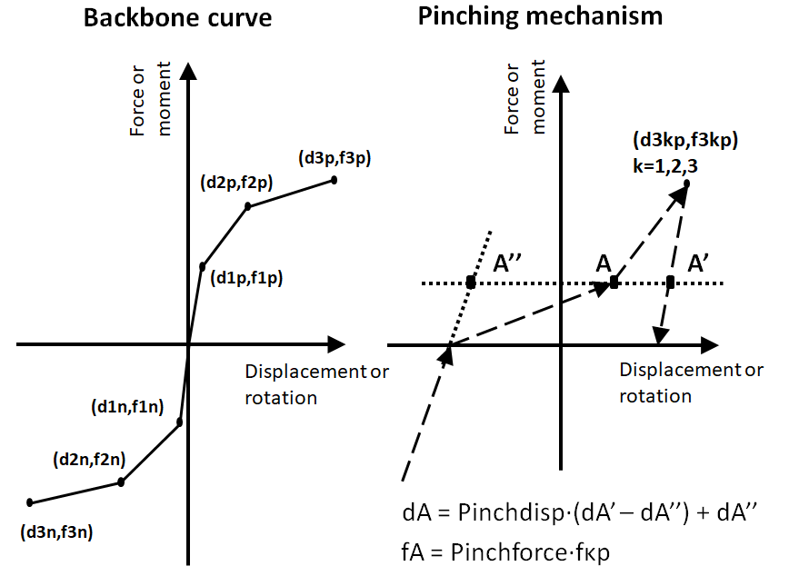 La curva Pinched_Asm è un modello uniassiale forza-spostamento caratterizzato da leggi di degradazione non lineare di rigidezza e resistenza e anche da un pinching di forze e spostamenti. Il deterioramento può essere incrementato a causa del danneggiamento dovuto all’energia e alla duttilità. La curva inviluppo del modello è definata dall’utente fornendo tre coppie di forze-spsotamenti per il ramo positivo e tre per il ramo negativo della curva inviluppo. Le forze e e gli spostamenti devono essere inseriti in ordine crescente per il ramo positivo e in ordine decrescente per il ramo negativo.