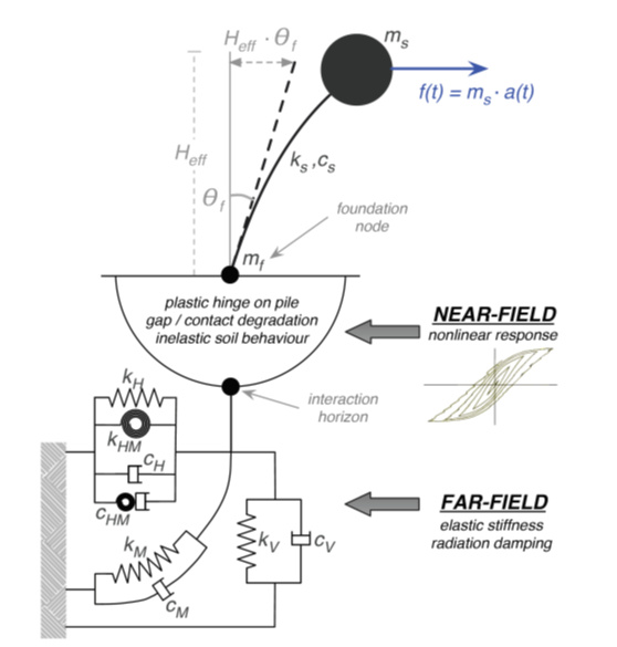 Questo elemento estende l’approccio a macro-elemento non lineare all’analisi di pali flessibili caricati lateralmente e interazione suolo-struttura. È basata sul lavoro di Correia e Pecker [2019b].La risposta laterale dell’intero sistema palo-terreno all’azione sismica viene concentrata tutta alla testa del palo, essendo rappresentata da un elemento zero-lenght collocato alla base dei pilastri e soggetto all’input motorio delle fondazioni, come mostrato nella figura sottostante.