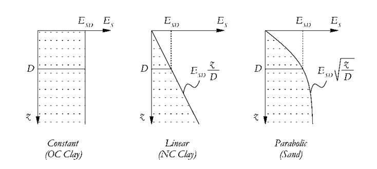 In Gazetas [1991] sono fornite le espressioni per il calcolo diretto della rigidezza laterale e assiale oltre al coefficiente di smorzamento. Queste sono valide per per profili di suolo con incremento di rigidezza del terreno lungo la profondità costante, lineare o parabolico, che sono rappresentati nella figura sottostante.