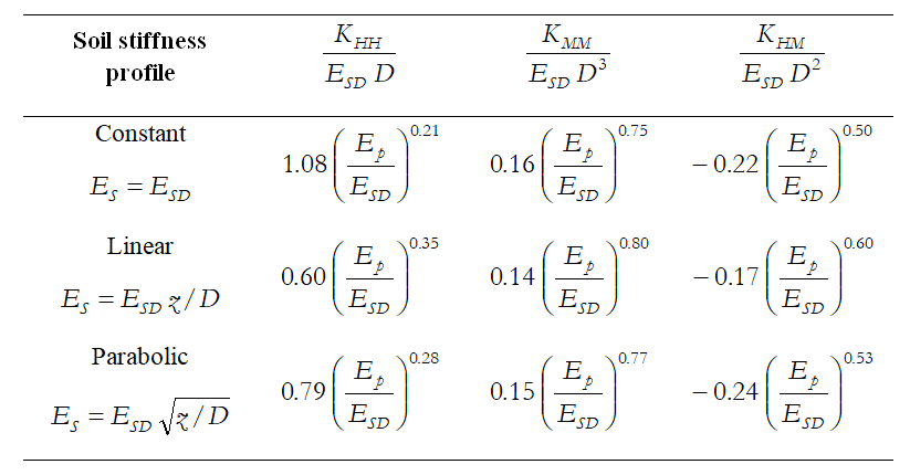 Le espressioni per larigidezza statica del palo sono adattate le espressioni dell’ EC 8 – Part 5 [2003]. con leggere modifiche. Queste si possono ritenere valideper pali flessibili o profondi e sono riassunte nella tabella sottostante