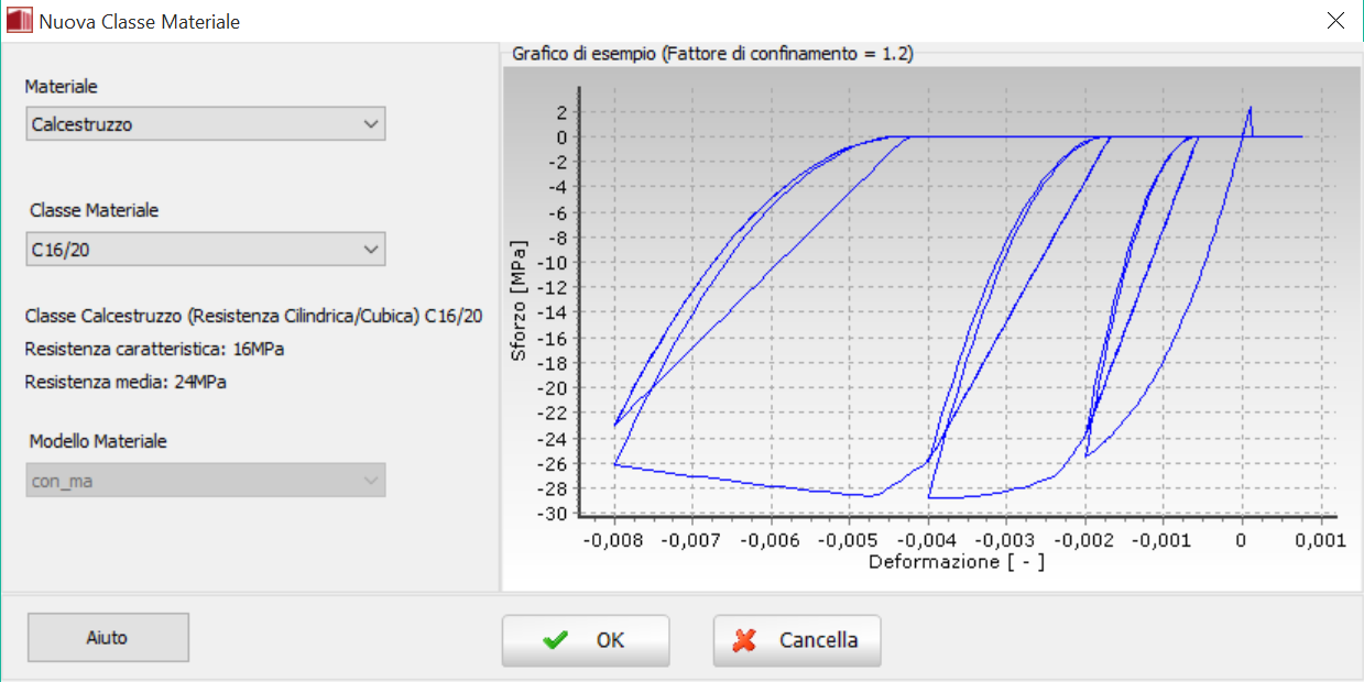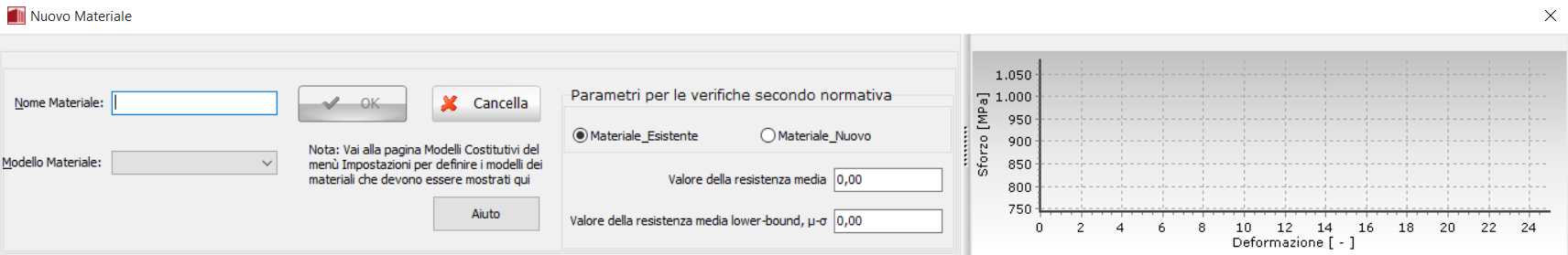 Quando l'utente preme sul pulsante Aggiungi Classe Materiale si apre una finestra di dialogo in cui può essere selezionato, tramite menù a tendina, il tipo di materiale e il corrispondente modello. I materiali che sono disponibili in questa finestra sono quelli più largamente diffusi e prescritti in normativa (ad esempio la classe C25/30 per il calcestruzzo, etc.)