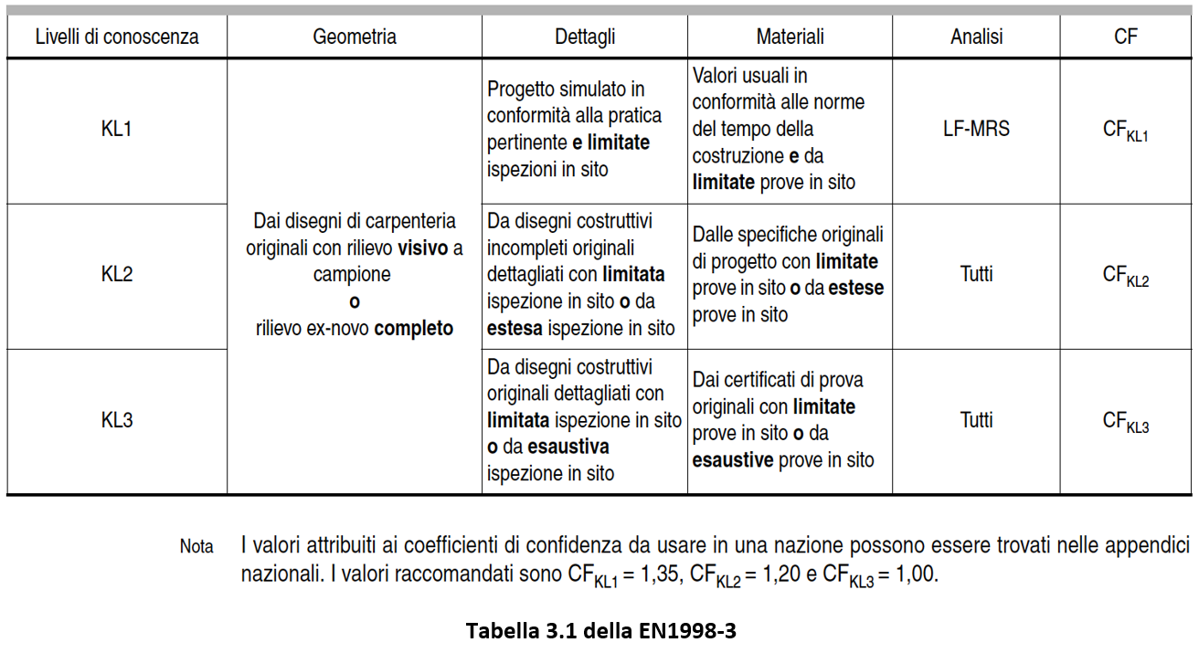 Nell’immagine seguente (tabella estratta dalla EN1998-3) vengono forniti un riassunto e le raccomandazioni sui coefficienti di confidenza e i conseguenti metodi di analisi ammessi per ciascun livello di conoscenza.