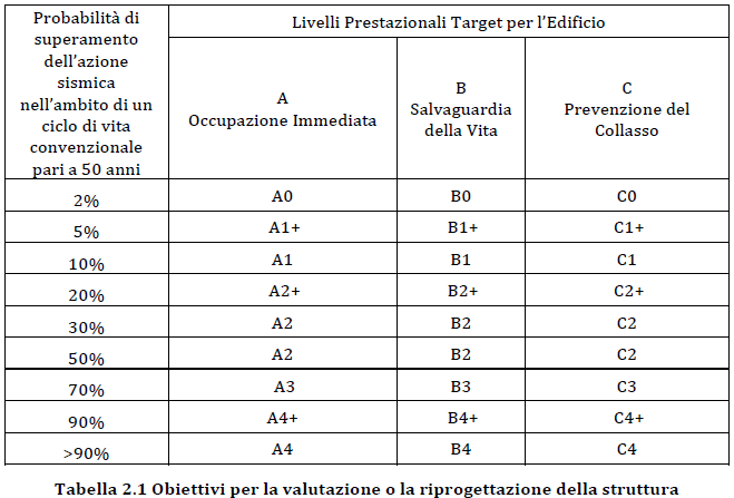 I livelli prestazionali target per l’edificio fanno riferimento allo stato di danneggiamento della struttura definito tramite tre stati limite, chiamati, rispettivamente, Stato Limite di Occupazione Immediata (A), di Salvaguardia della Vita (B) e di Prevenzione del Collasso (C).