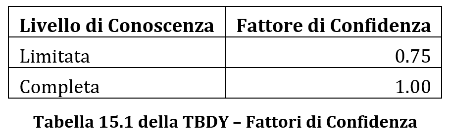 Nella seguente tabella della sezione 15.2.12 della TBDY sono riportati i fattori di confidenza per ciascun livello di conoscenza.