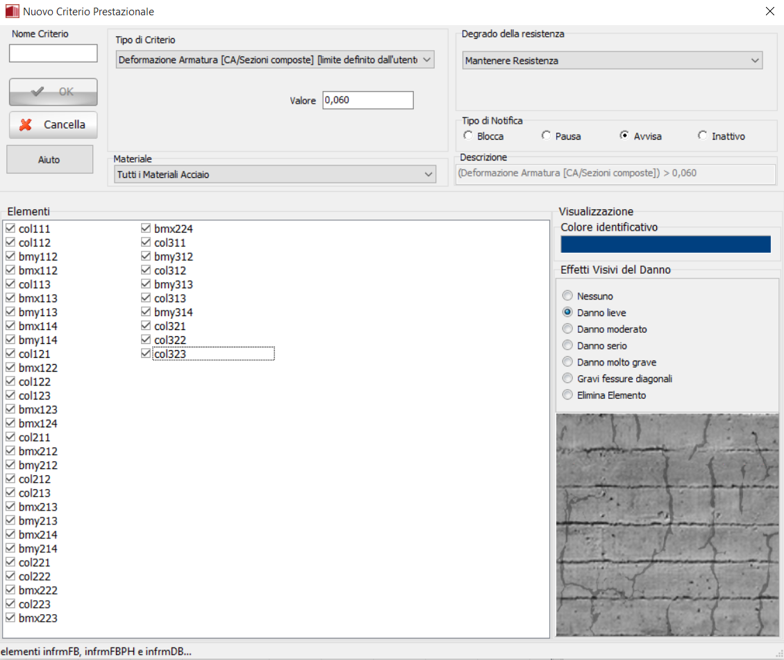 - Fessurazione degli elementi strutturali. Può essere individuata controllando quando si verificano deformazioni (positive) nel calcestruzzo maggiori del rapporto fra la resistenza a trazione e la rigidezza iniziale del materiale calcestruzzo. [valore tipico: +0.0001]