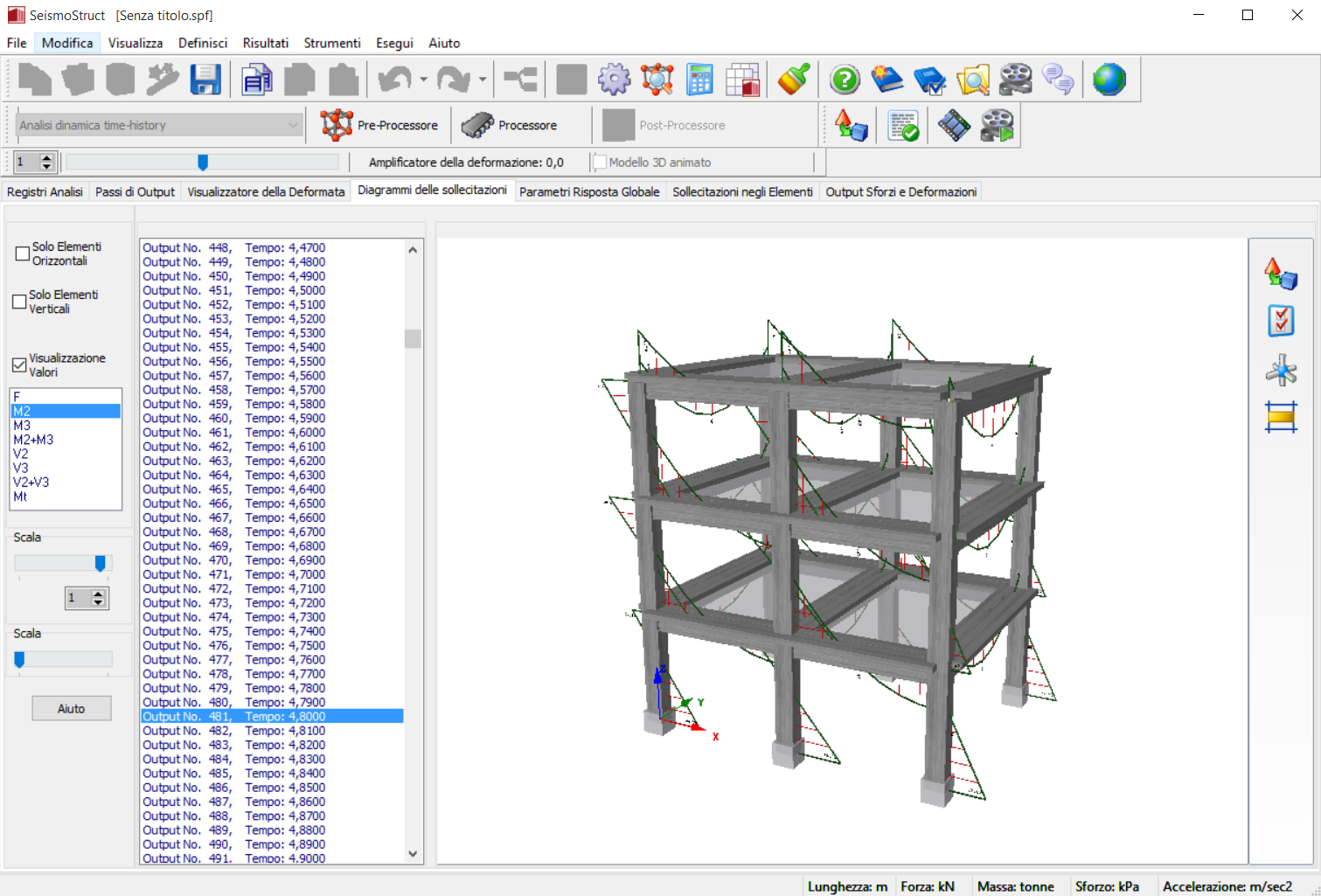 In questo modulo vengono forniti, in modalità 3D, i diagrammi delle forze interne (assiali e di taglio) e dei momenti (flessionali e torsionali). Come impostazione predefinita, i diagrammi per gli elementi orizzontali e quelli per gli elementi verticali vengono mostrati nello stesso grafico. Se gli utenti desiderano visualizzare i diagrammi separatamente (ossia, solo per gli elementi orizzontali o verticali), devono pertanto selezionare la casella appropriata. Inoltre, è anche possibile scalare i diagrammi e lo spessore delle loro linee. Gli utenti possono personalizzare l'aspetto dei diagrammi tramite il tab 'infrm' o 'elfrm' del menu Opzioni Immagine 3D (cioè i colori della linea principale e di quella secondaria, il numero di righe e il numero di valori).