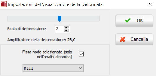 Infine, e nel caso di analisi dinamica, è anche utile barrare l'opzione Fissa nodo selezionato, in modo che vengano plottati solo gli spostamenti relativi della struttura, che sono quelli di interesse ingegneristico; perchè questa opzione funzioni il 'nodo selezionato' deve ovviamente essere un nodo alla base della struttura.
