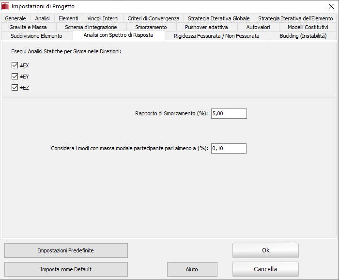 In SeismoStruct v7.0 è stata aggiunta l'Analisi con Spettro di Risposta. In questo menu gli utenti possono scegliere in quali direzioni verranno prese in considerazione le componenti sismiche; per impostazione predefinita sono selezionate tutte le direzioni (ossia ± EX, ± EY, ± EZ). Inoltre, sempre in questo menu, vengono definiti sia il rapporto di smorzamento del modello, che i modi da prendere in considerazione in base alla massa modale partecipante minima. Il valore predefinito del rapporto di smorzamento è del 5%, mentre per la massa modale partecipante minima dei modi da considerare è impostata una soglia dello 0.1%.